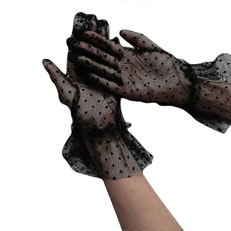 Women Sheer Lace Short Tulle Full Finger Gloves Vintage Polka Dot Ruffled Trim Mesh Wedding Prom Evening Party Mittens