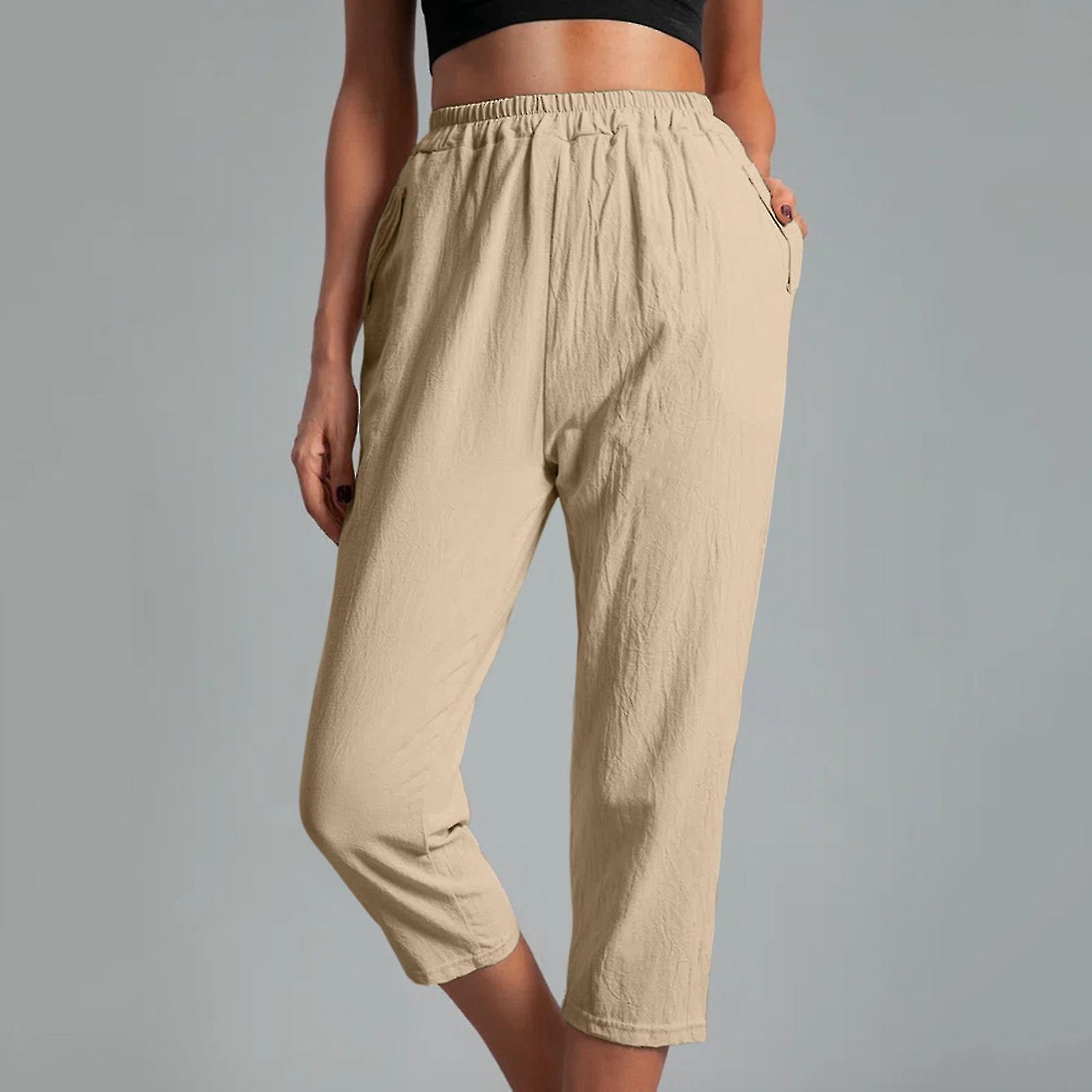 Women Casual Solid Color Pockets Elastic Waist Comfortable Straight Calf-length Pants