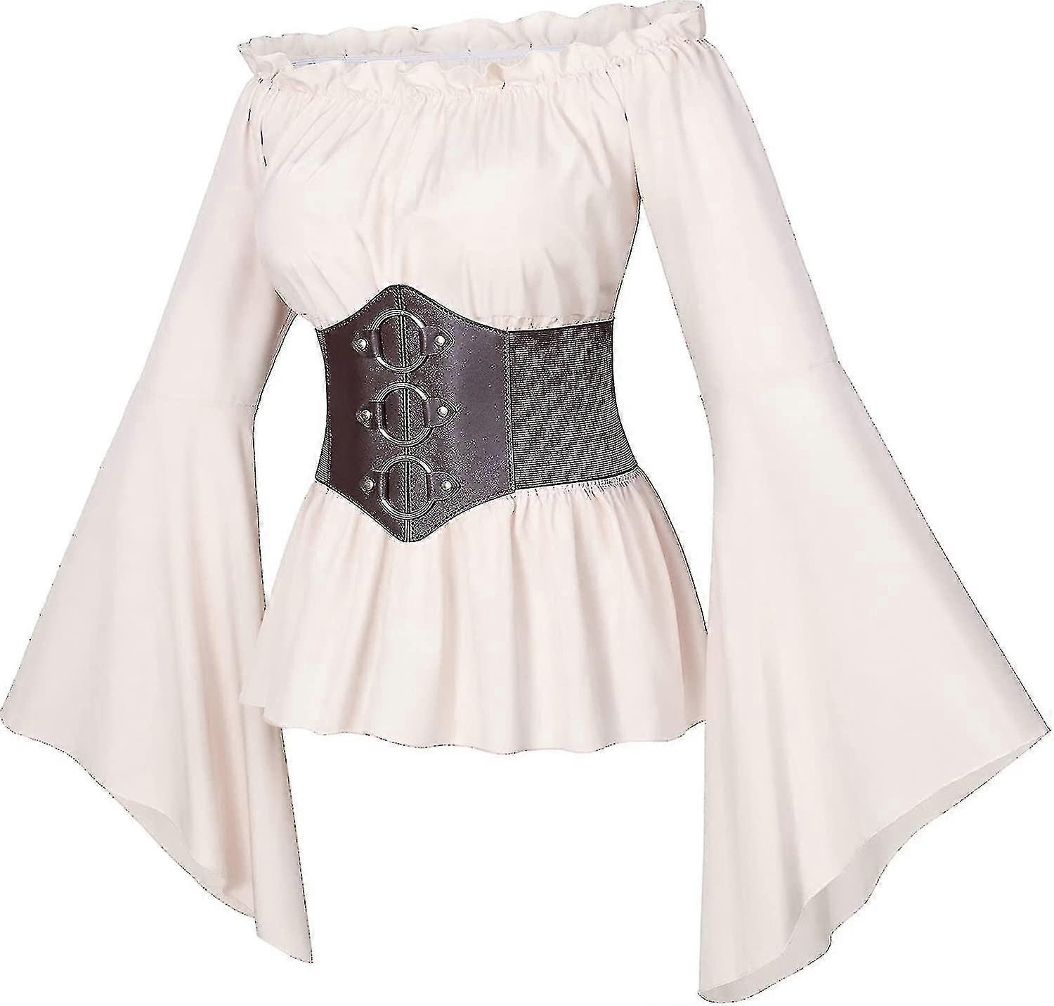 Womens Renaissance Victorian Peasant Ruffle Smocked Waist Boho Pirate Shirt Blouse With Belt Set-AM