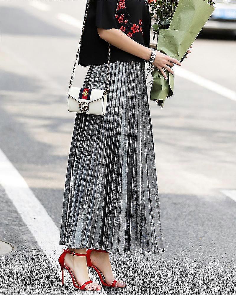 Women's Premium Metallic Shiny Shimmer Accordion Pleated Long Maxi Skirt