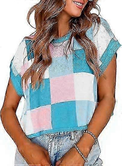 Womens Cap Sleeve Crop Tops Summer Color Block Going Out Crew Neck Knit