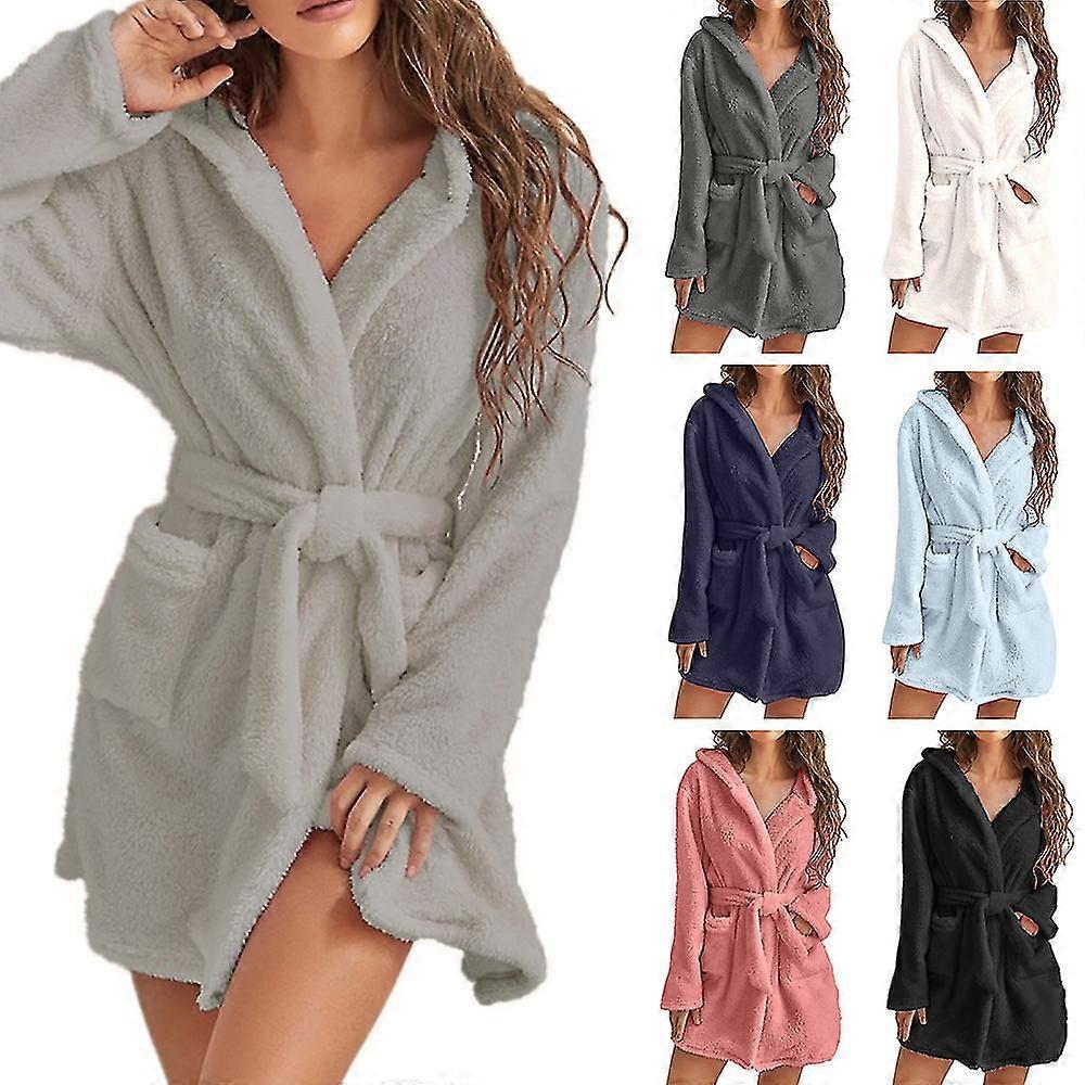 Women Soft Plush Fleece Robe Hooded Mid Length Pocket Bathrobe
