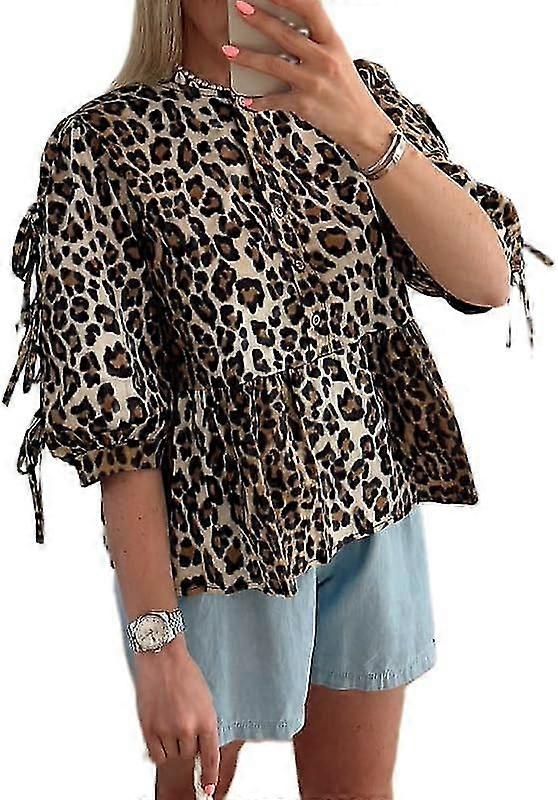 Women Leopard Peplum Blouses Tie Front Blouses 3/4 Puff Sleeve Lace Up Babydoll Tops Bandage Ruffle Hem Summer Shirts Newway