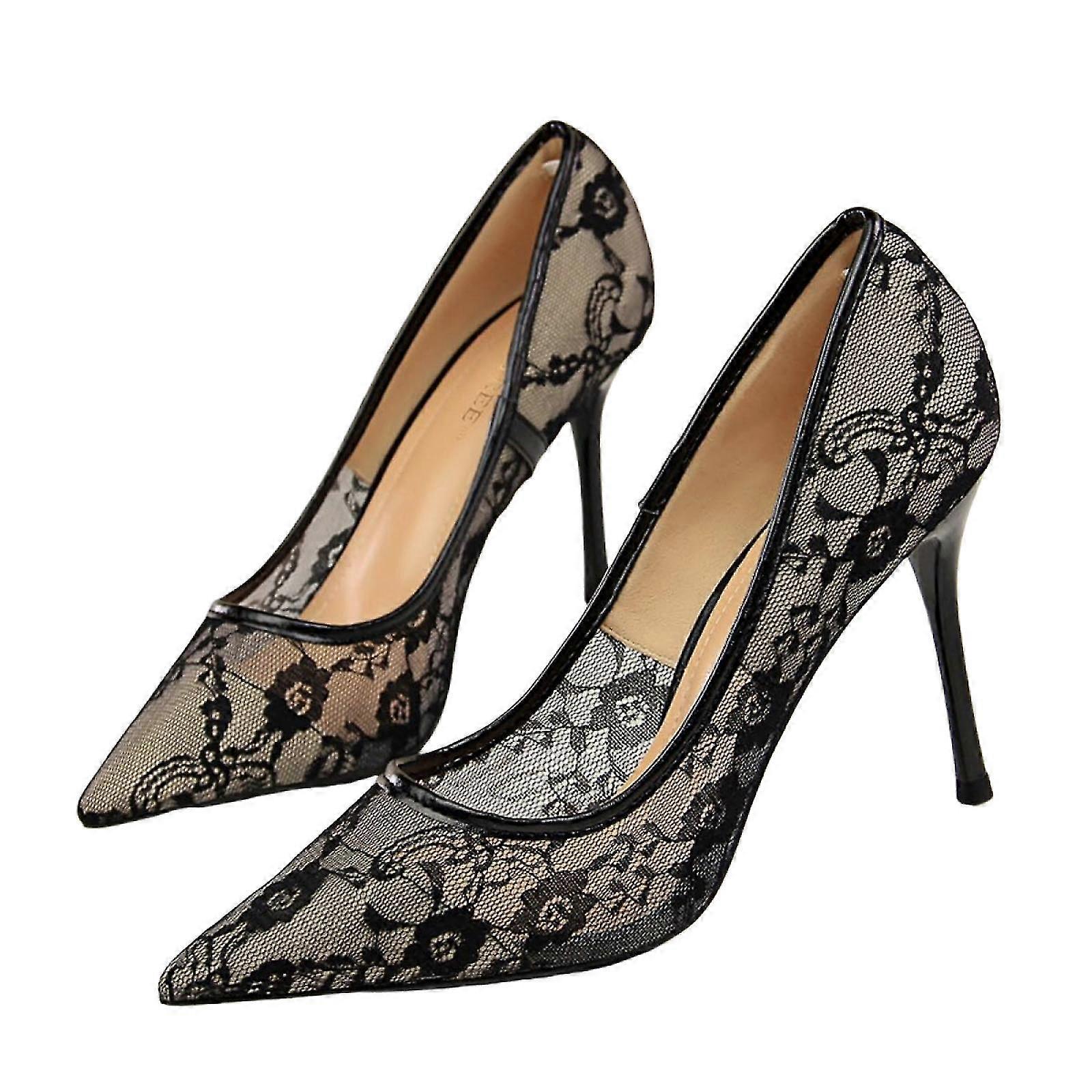 Women's Sexy Mesh Lace Pumps, 4 Inch High Heels Pointed Toe Closed Stiletto Sandals, Slip-on Shoes
