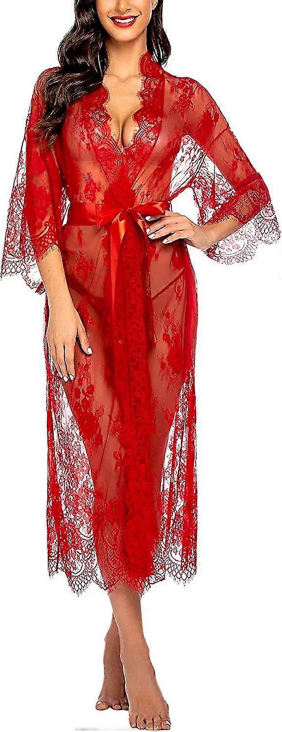 Women Sexy Long Lace Lingerie Kimono Robe Sheer Babydoll Nightgown Nightdress S-3xl