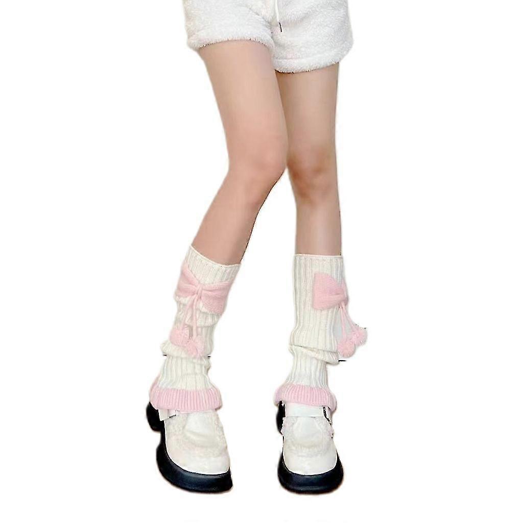 Women Ribbed Knit Cute Pompom Bowknot Leg Warmer Ruffle Flared Hem Long Socks