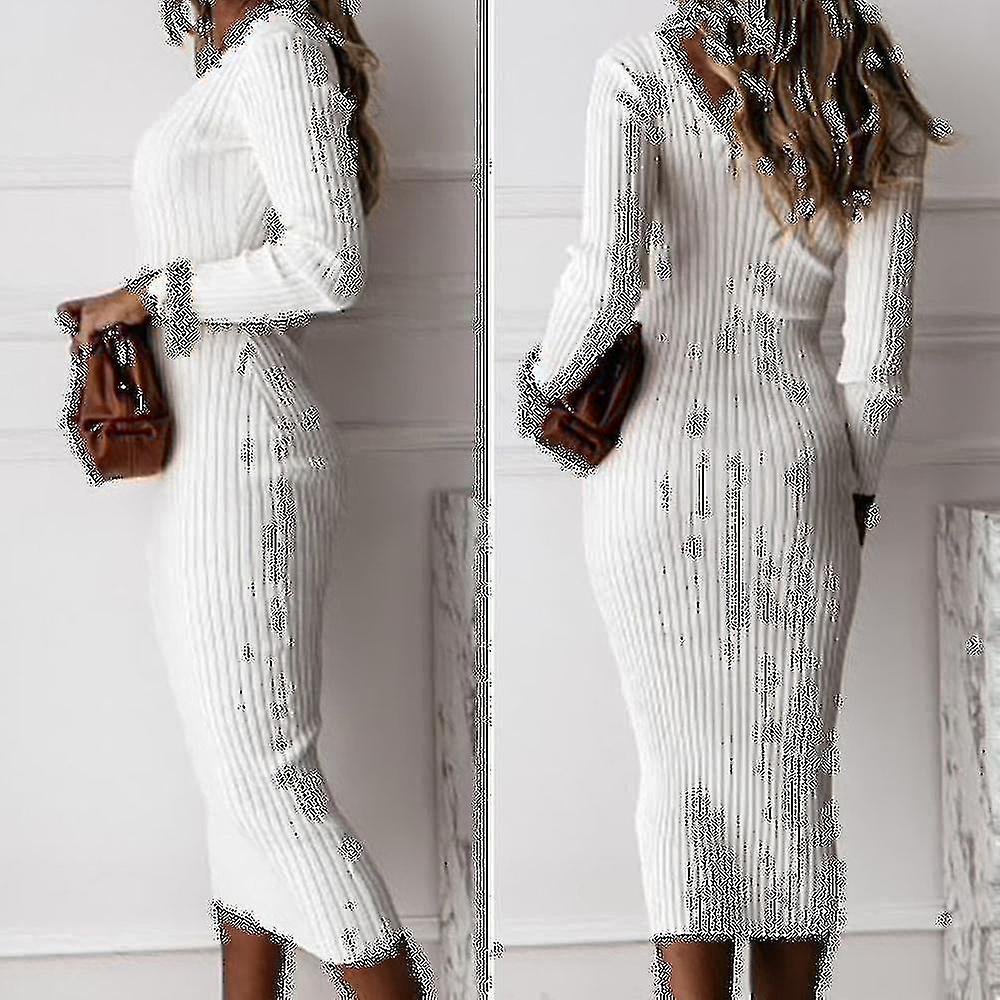 Women Ribbed Knitted V-neck Long Sleeve Bodycon Sweater Stretch Slim Fit Midi Dress