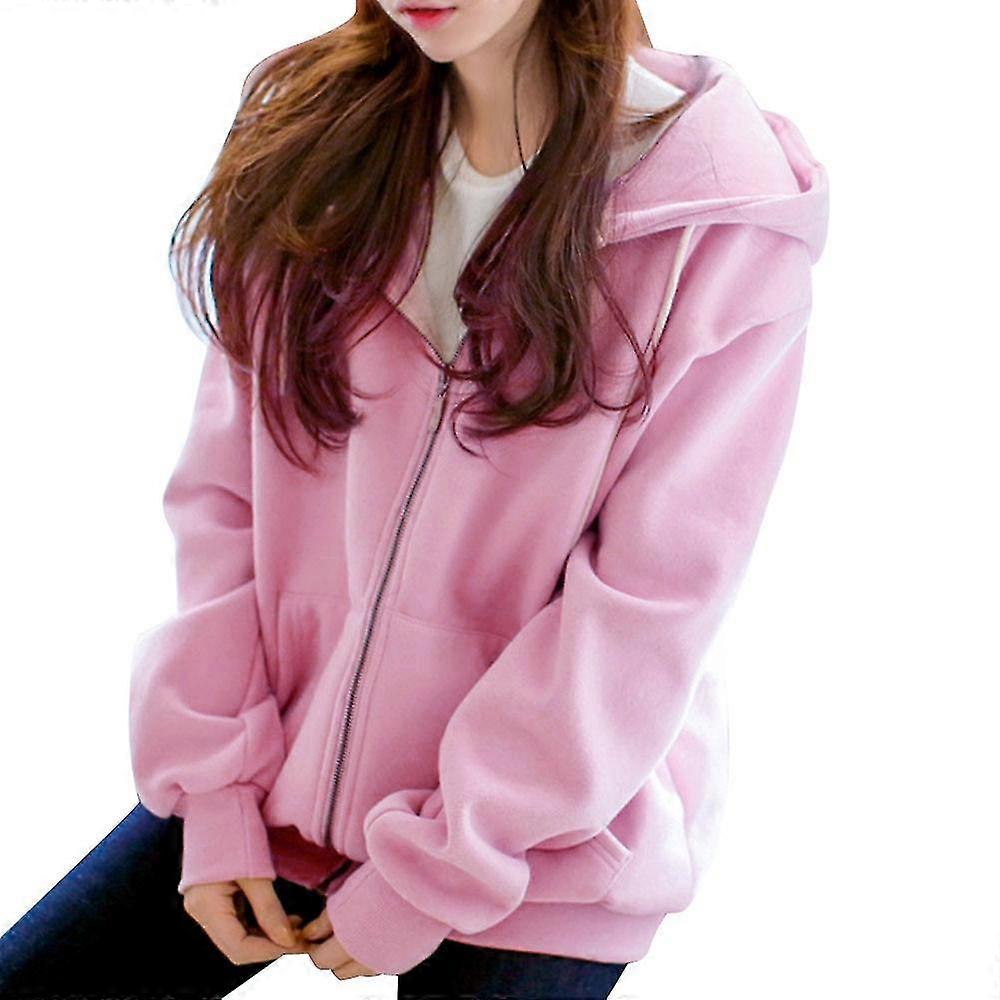 Women Hooded Fleece Long Sleeve Loose Casual Zip Pockets Solid Jacket Coat