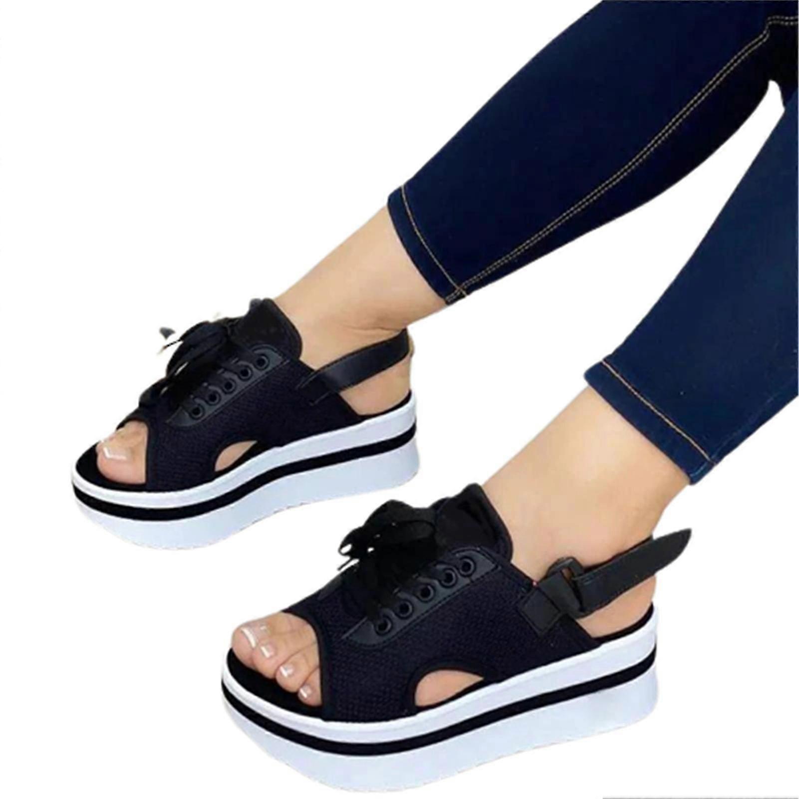 Women Chunky Platform Sandals Tie-up Upper PU Shoes Hook & Loop Heel Strap