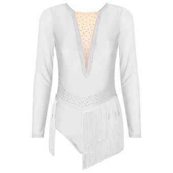 المرأة مهدب الرقص اللاتيني ليوتار اللباس شبكة شفافة كم طويل شرابة بذلة الجمباز بدلة امرأة الجليد التزلج اللباس