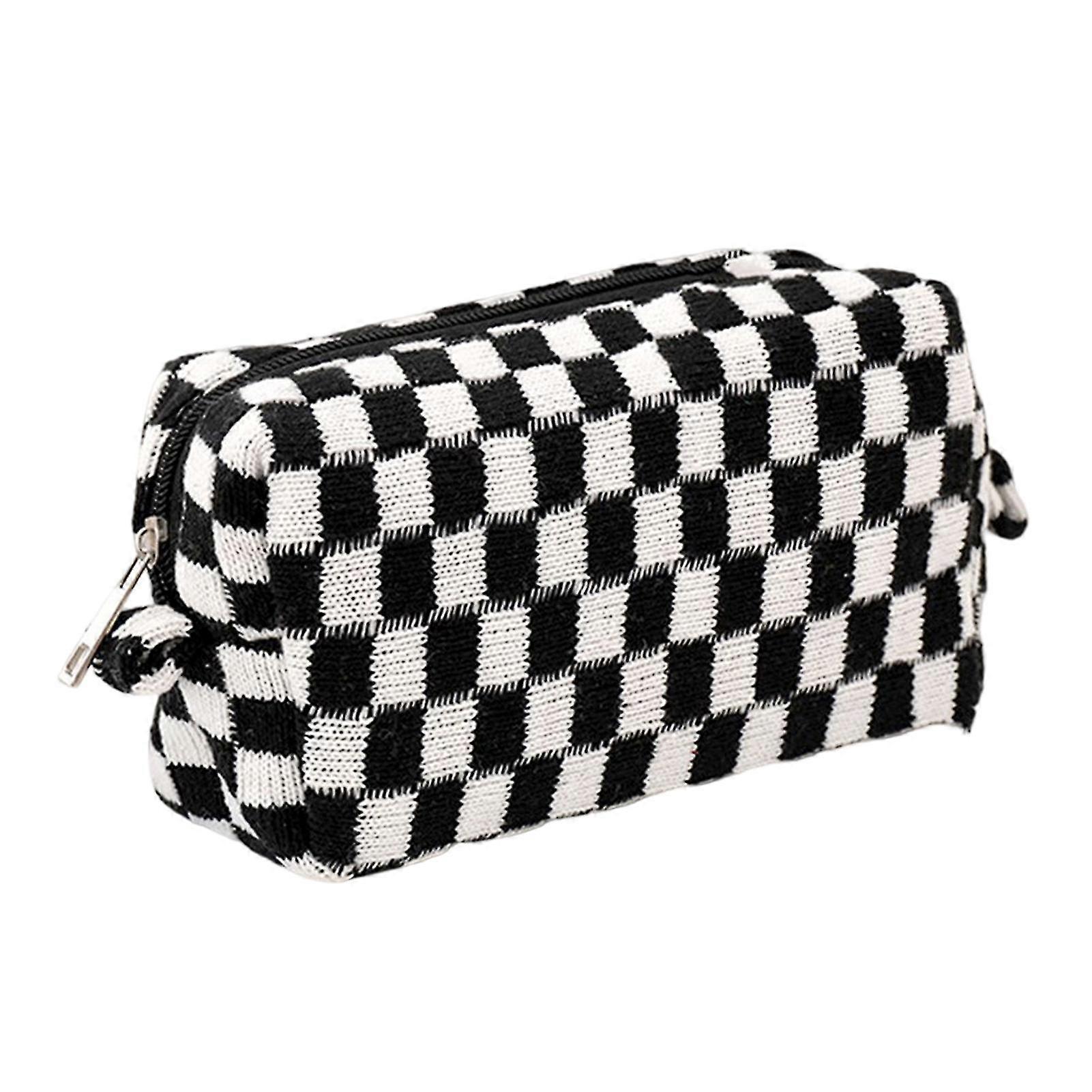 Women\'s Simple Style Checkerboard Knitted Cosmetic Bag Large Capacity Organizer Pencil Pouch