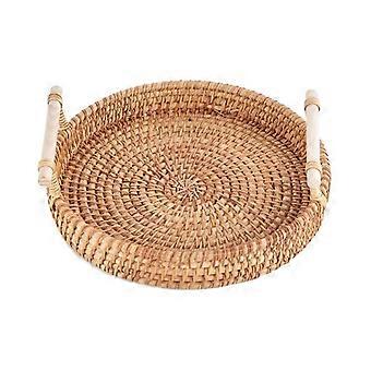 Handwoven Rattan Storage Tray With Wooden Handle Round Basket Bread Food Plate Fruit Cake Platter D