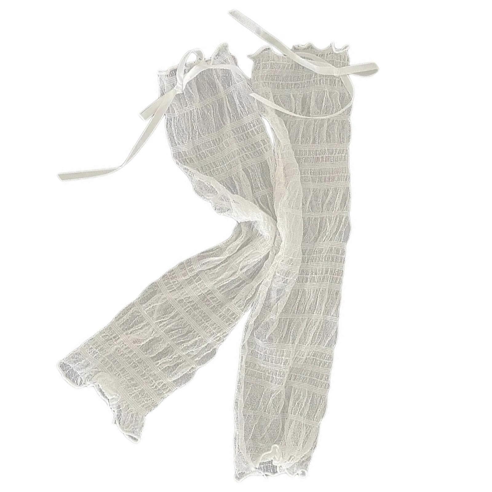 Japanese Women Thin See Through Pleated Ruched Mesh Leg Warmer Cute Ribbon Bowknot Ruffle Leg Cover Calf Length Socks White
