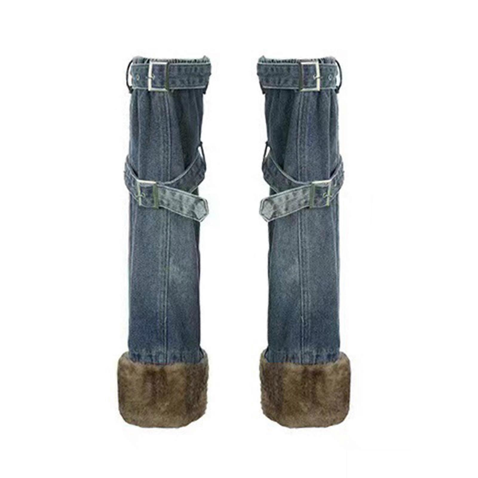 Women Furry Spliced Jeans Leg Warmer with Buckled Bandage Punk Denims Flared Boot Cover Over Knee Long Socks Streetwear