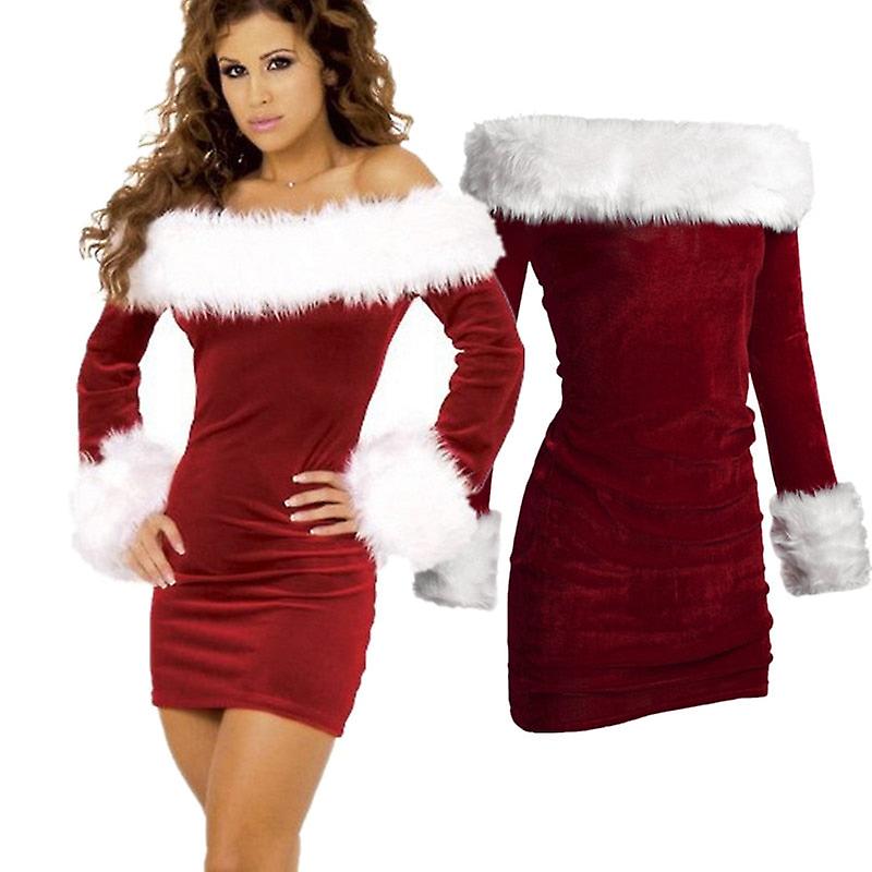 Women Sexy Slim Fit Strapless Xmas Mini Dress Red Velvet White Fur Christmas Costumes Adult Santa Claus Cosplay Costume