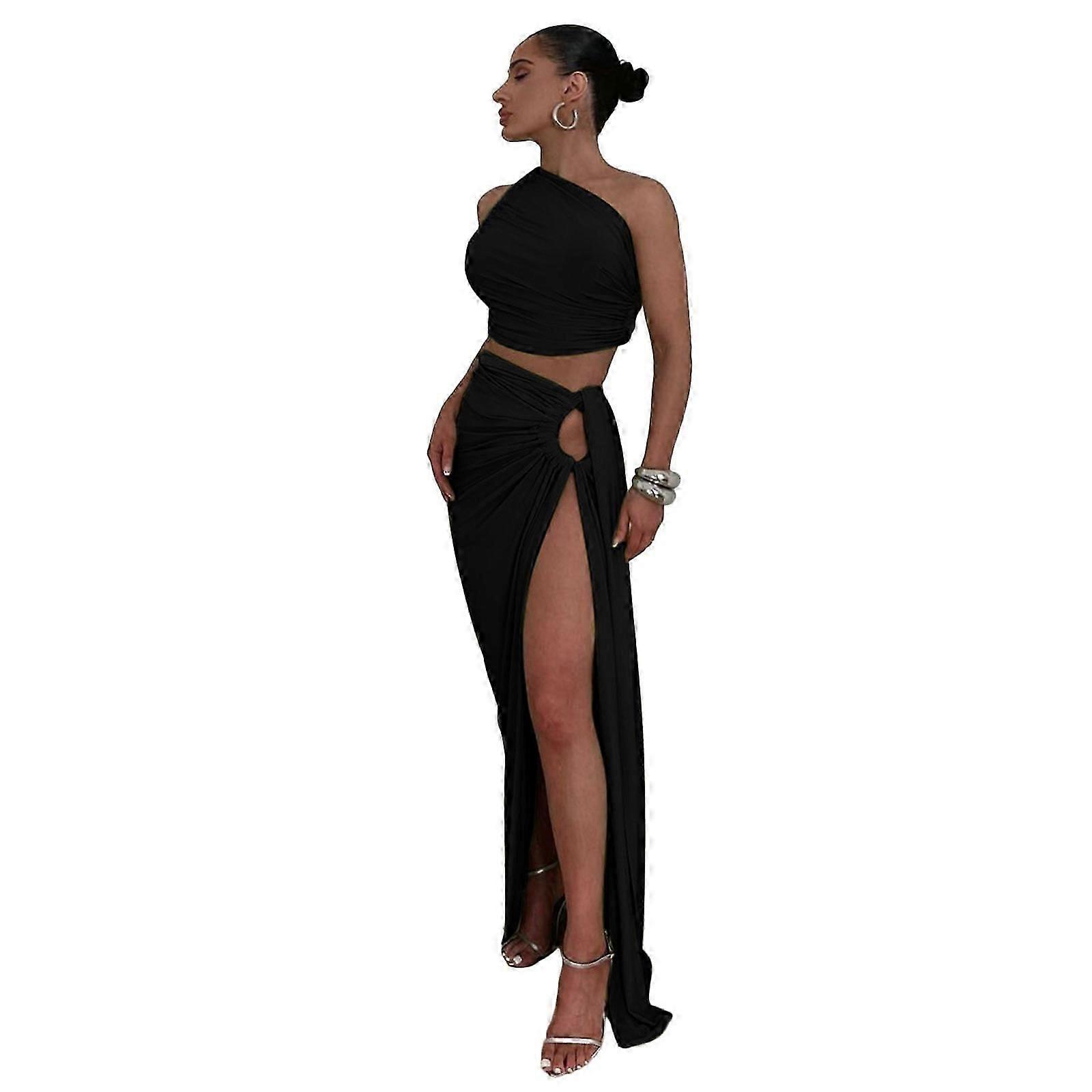 Women 2Pcs Beach Outfit Sleeveless One Shoulder Crop Top & Split Maxi Skirt Set Rose Red