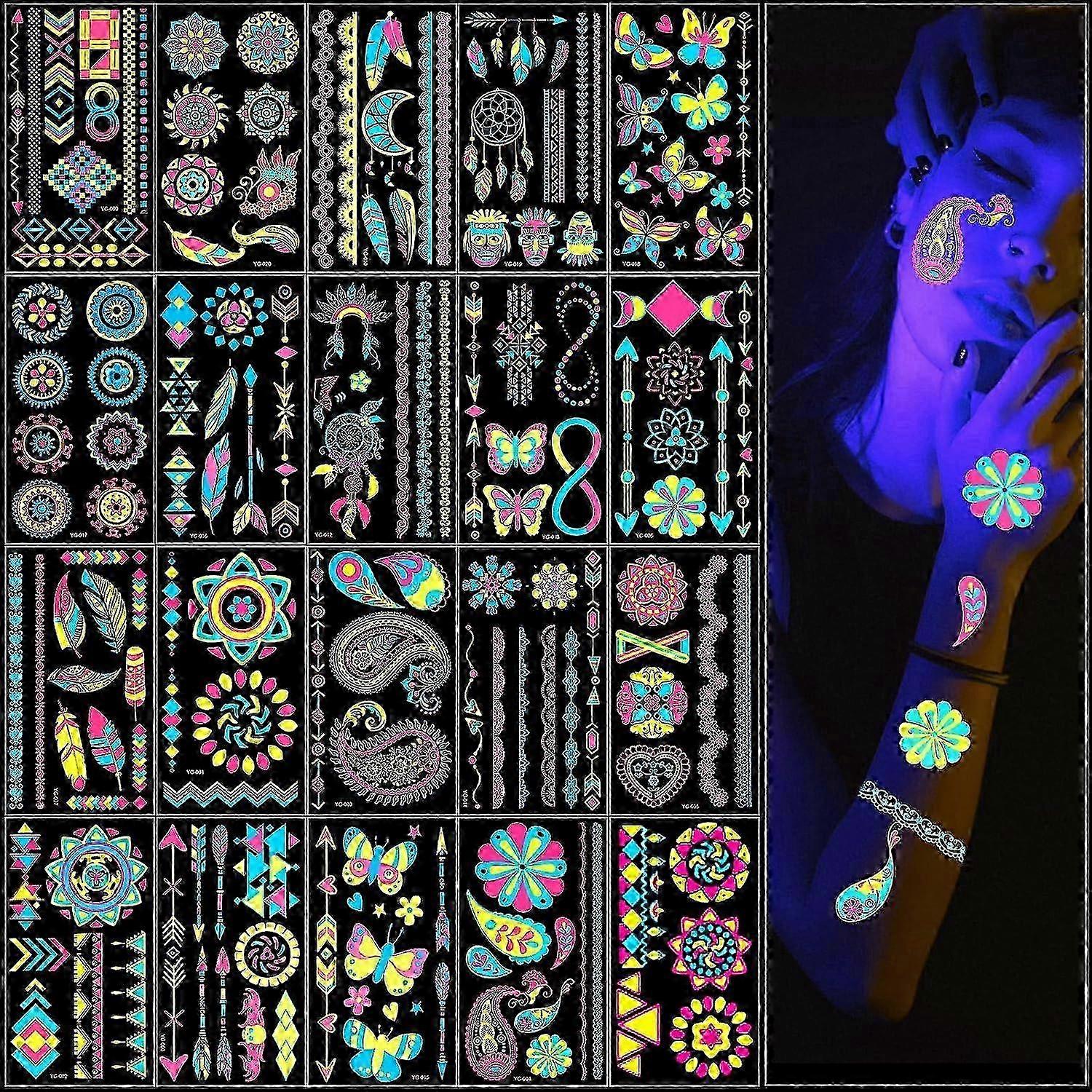 Neon Temporary Tattoos,20PCS Multiple Designs Glow in the Dark Neon Tattoos,UV Fake Waterproof Tattoo Stickers Festival Accessories