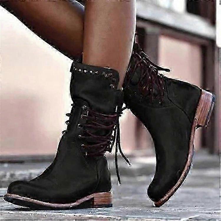 Women Boots Retro Motorcycle Boots Female Pu Leather Shoes Rivet Block Lace Up Fashion Low Heel Mid Calf Boots Plus Size