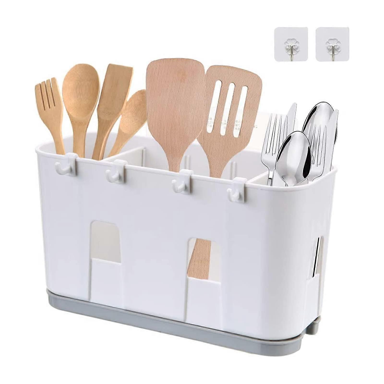 Cutlery Drying RackWith small drain holes and water holding tray, the plastic utensil drain can keep your utensils and sink area clean and hygienic. This cutlery drying also makes your kitchen table tidy. Multiple StorageThere are 3 compartments of the drying cutlery to organize spoons, forks, knives. The small hanging bar on the utensil holder back is perfect for sponges, dishcloth or small kitchen tools. Material and SizeOur sink utensil holder is made of high-quality ABS, durable. Size of utensil drying is approx. 8.7*3.9*4.7/ 22*10*12cm. Color: White with gray draining utensil. Removable Utensil holderThe utensils drying rack is easy to remove and install. Each part is handy to clean. You can put the utensil drying basket on the kitchen table. With strongly adsorbed hook, the plastic draining rack also can be hung on the wall. Warm tipPlease note if you hanging the cutlery drying on the wall, the bearing capacity is limited, approx 3kg.