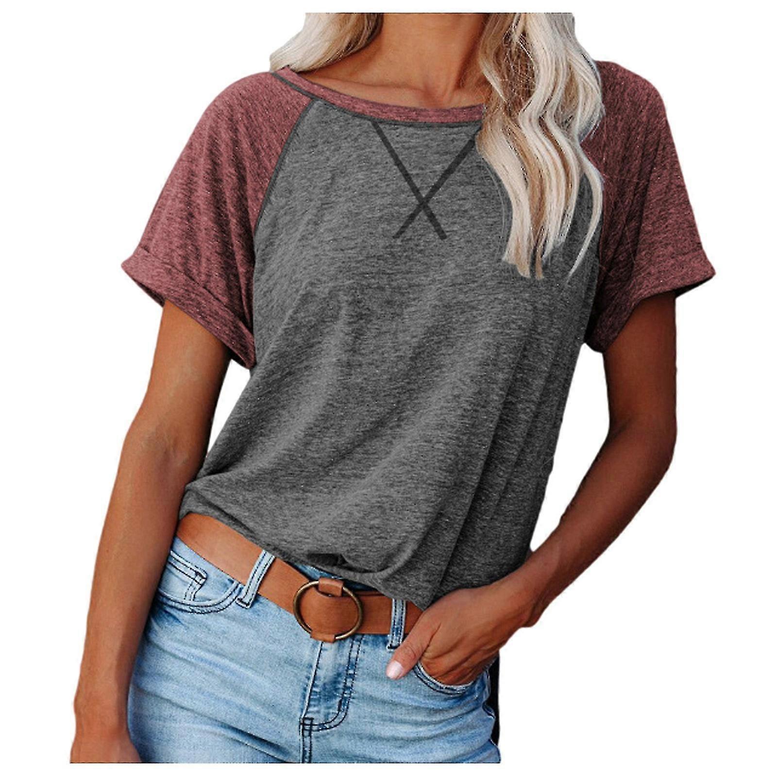 Fashion Womens Solid Color Splicing Round Neck Casual Short Sleeves Tops