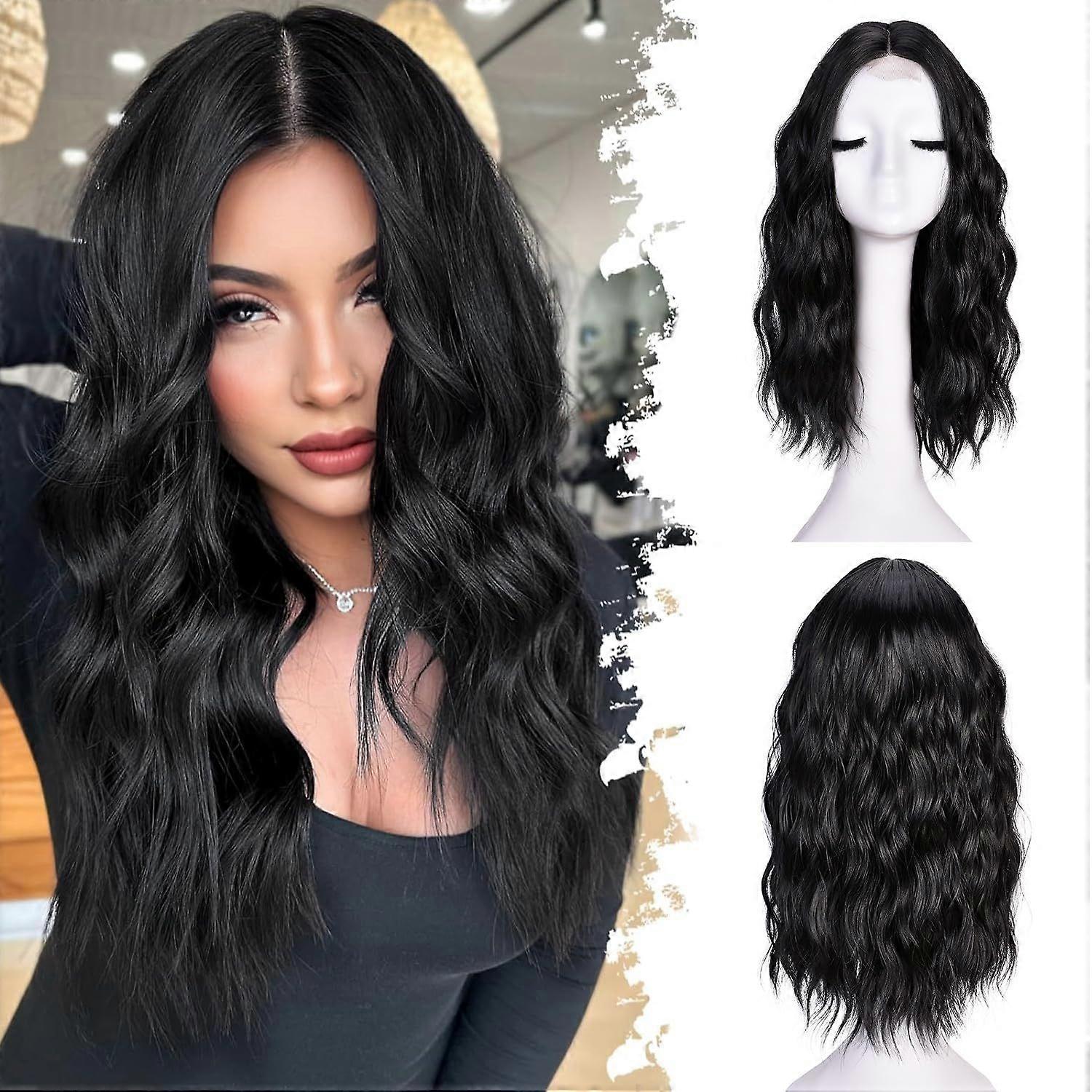 Black Short Wavy Wigs for Women 18Inch Bob Wave Wig Middle Part Synthetic Lace