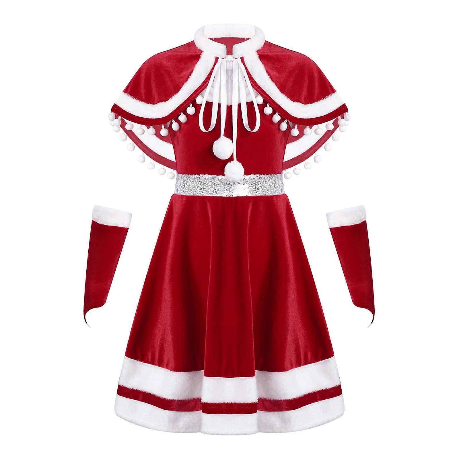 Kids Girls Christmas Dress with Cloak Arm Sleeves 3Pcs Set Santa Claus Red Velvet Fluffy Tutu Dress Party Princess Dresses 4-14Y