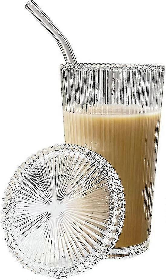 Glass Cups With Lids And Straws, 375ml Ribbed Vertical Striped Glass Coffee Mug, Glass Tumbler For C