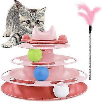 4 Layers Cat Tower Roller Toys, Interactive Cat Toys with Rotating Ball and Feather Stick for Cats Indoor Play, Pink