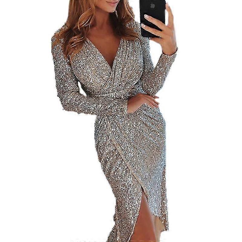 Elegant Sequined Glitter Party Dress Women V Neck Bodycon Glitter Long Sleeve Ladies Club Party Gown