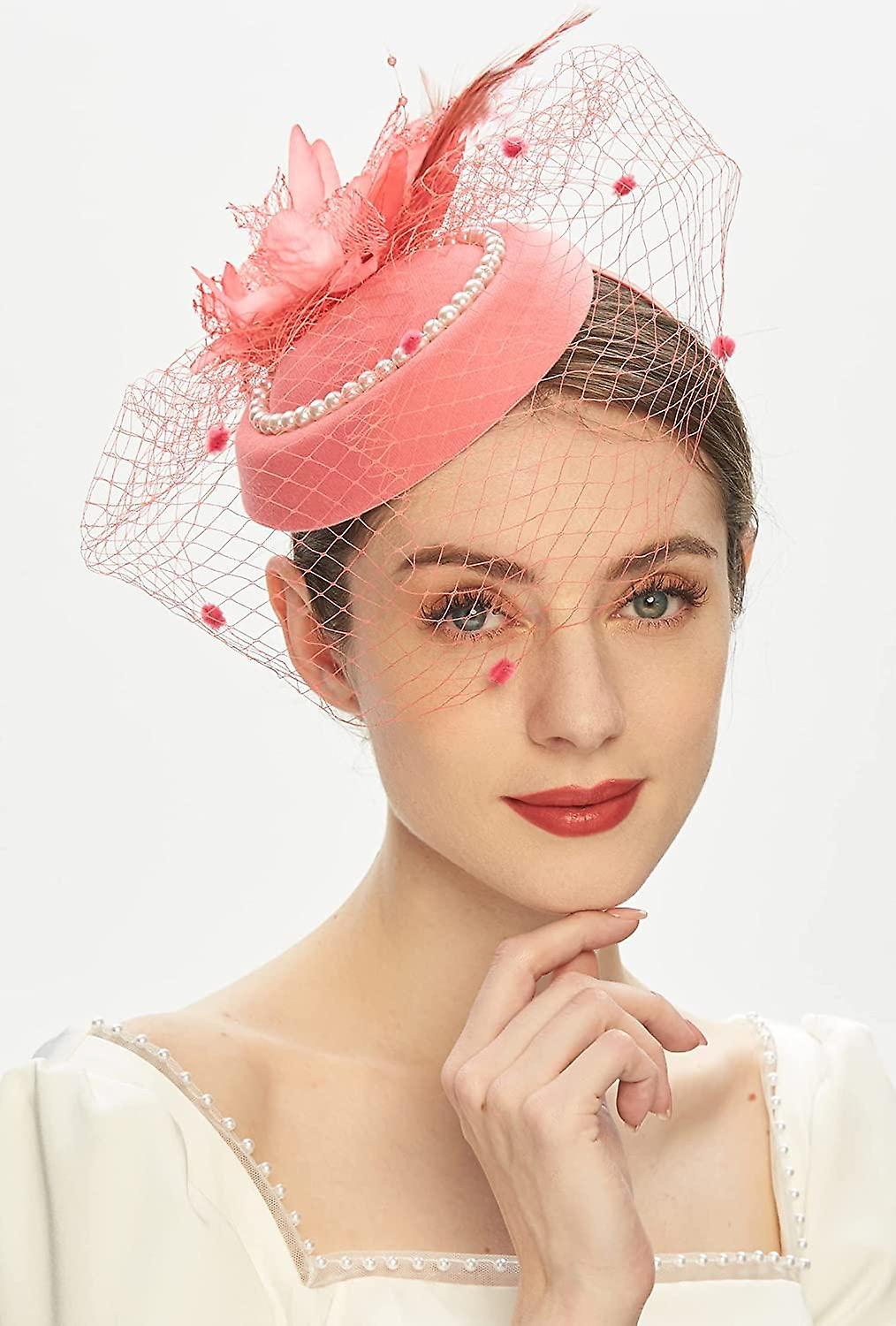 Elegant Pillbox Hats 20s 50s Vintage Fascinators for Women with Feather Mesh Veil Headband Bridal W