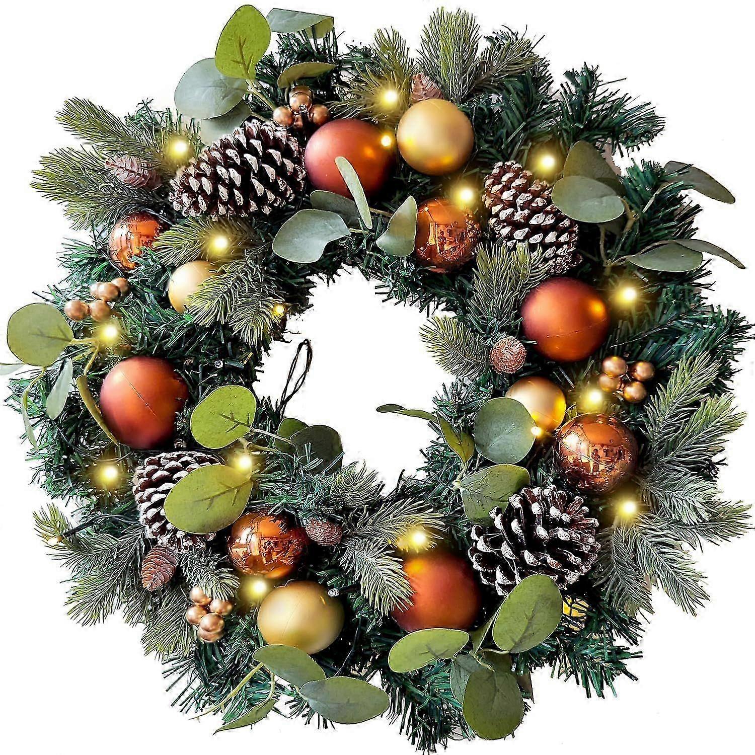 Pre-Lit 20 Inch Lighted Christmas Wreath for Front Door Decoration with Copper Gold Christmas Ball Ornaments,Battery Operated 30 LED Lights