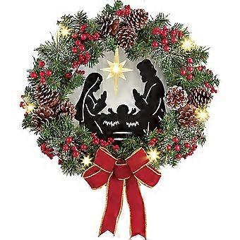 Christmas Wreath with Jesus Red Berry Pine Cone Nativity Scene LED Lights String Wreath Mixed Holiday Decorations