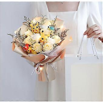 باقة دمية مع حقيبة هدايا وضوء LED دمية محشوة القطيفة Kawaii الصابون زهرة هدية مربع روز زهرة الكرتون هدايا عيد الحب