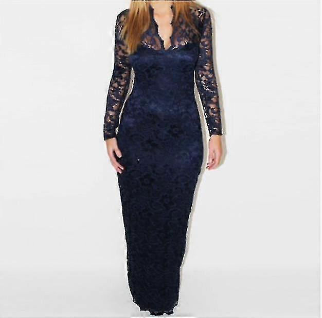 Plus Size Dress Women Lace Long Sleeve Scalloped Neck Cocktail Party Maxi Prom Gown Black Lace Long Dress With Scalloped Neck