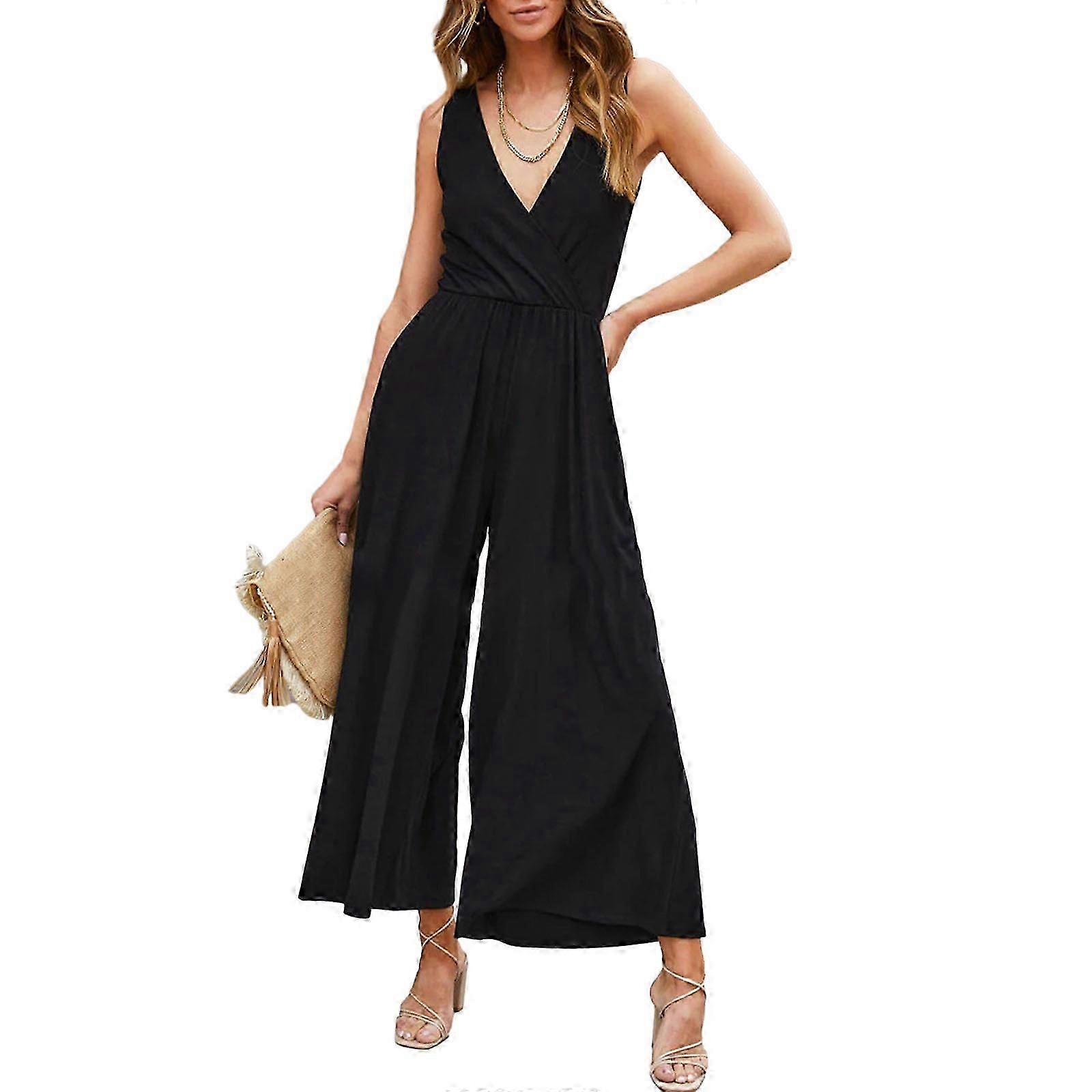 Sleeveless Jumpsuit Wrapped V Neck Elegant for Womens Girls Casual Solid Color Romper Outfits with Pockets camel XL