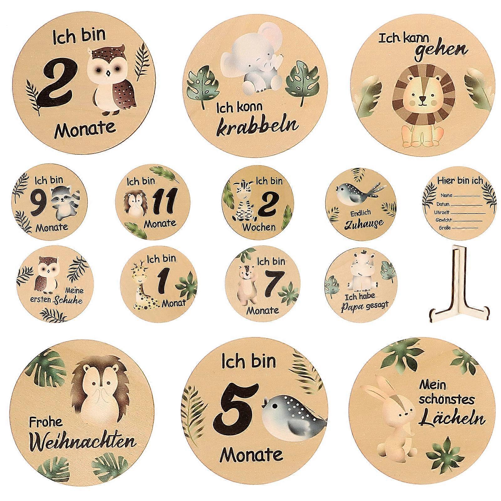 Wooden Milestone Cards Monthly Sign Discs with Display Stand Cute Animal Designs for Newborn Photography Birth Announcement