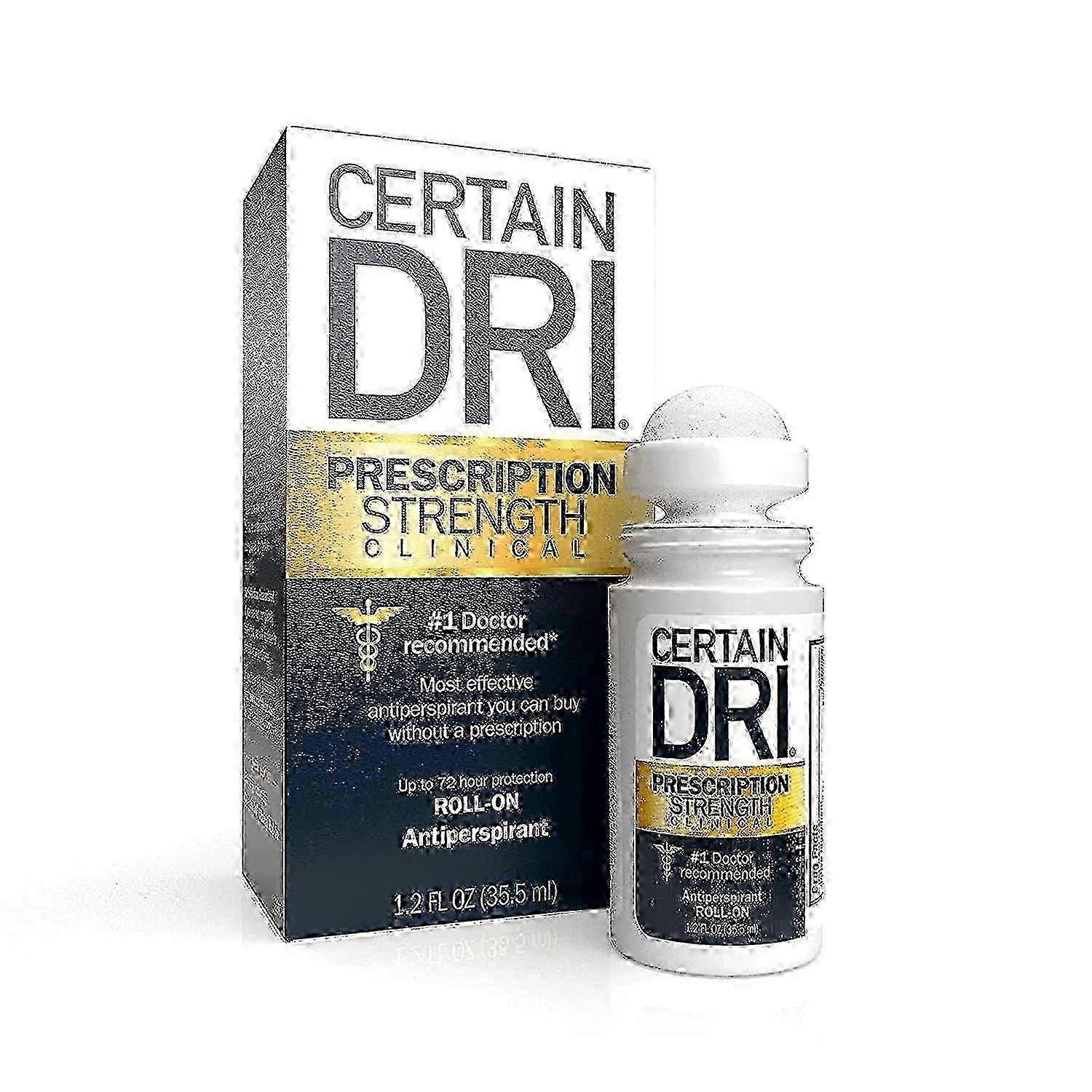 Regular deodorant doesn't always give you the protection you need, which is why you should use Certain Dri Anti-Perspirant. The roll-on antiperspirant is prescription strength, so it lasts three times longer and works harder than your normal antiperspirant at stopping excessive perspiration. Enjoy 72 hours of protection, dryness and confidence.Features & Benefits: Effective for up to 72 hours of sweat and odor protection Same active ingredient as prescription anti-perspirants: aluminum chloride Water-based, which makes it gentler on skin Should not wash off after bathing or showering, if application instructions are followed Colorless and fragrance free This No. 1 doctor-recommended, non-prescription product is applied several times a week at bedtime Suggested Use: Apply to underarms only. UPC: 889476715126 Weight: 0.44 lbs