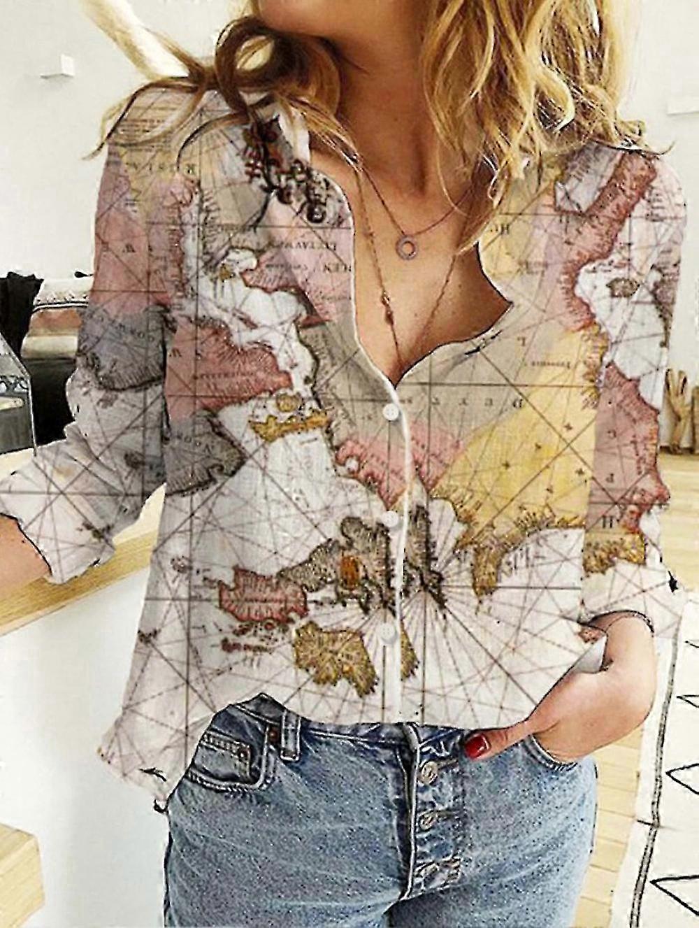 Ladies Long Sleeve Blouse Tops with World Map Design in Cotton Linen Plain Style for Women