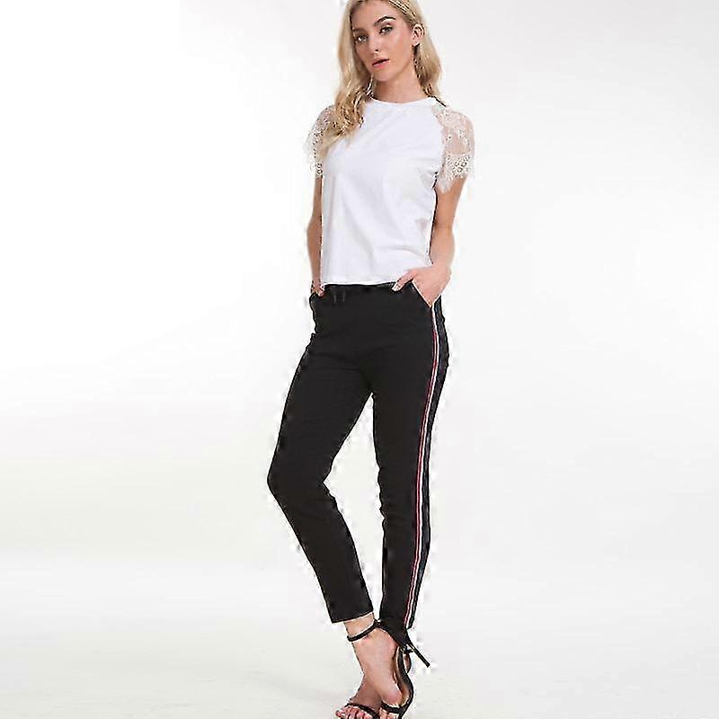 Vangull Womens High-Waist Striped Skinny Pants - Black Casual Pencil Trousers for Ladies