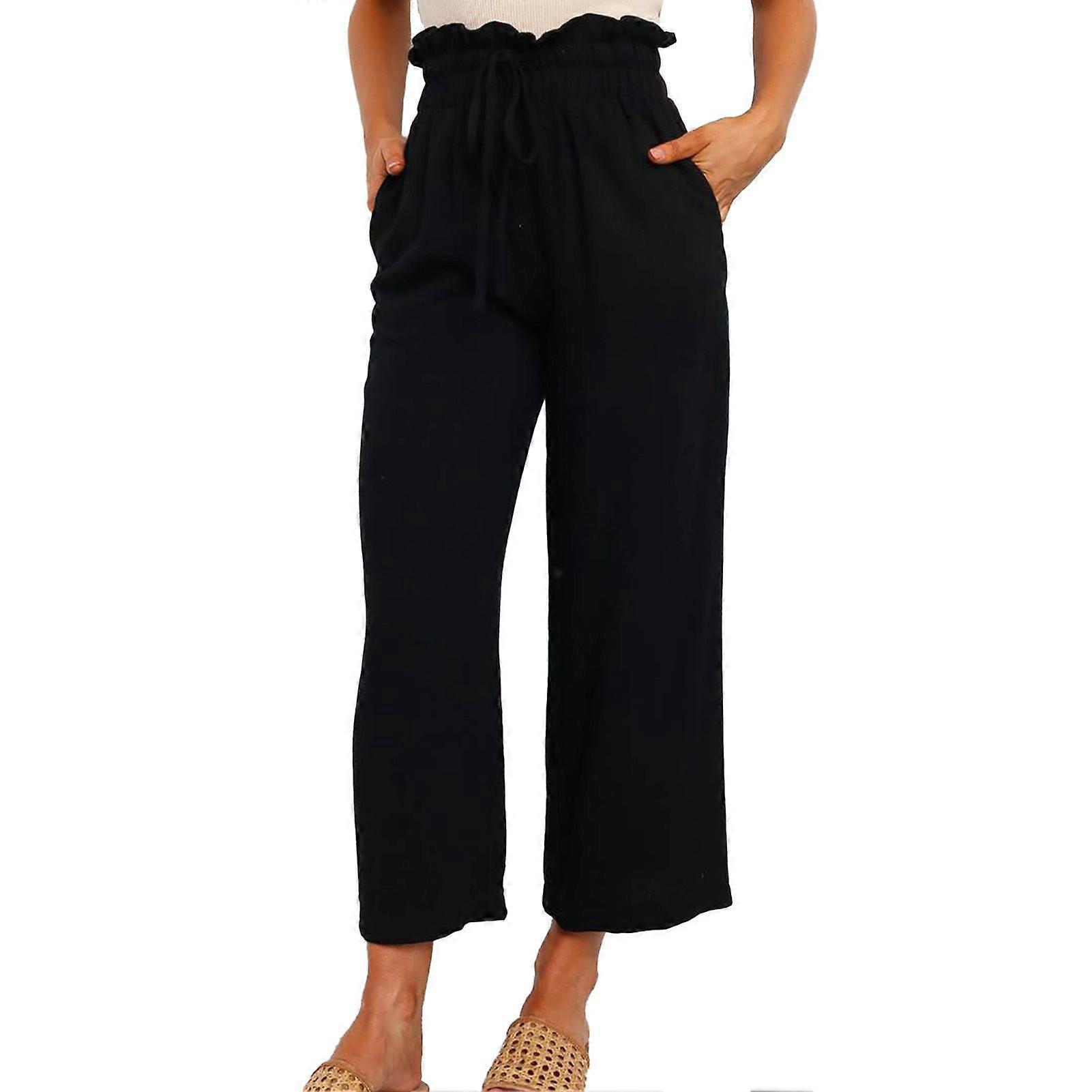 Women Linen Pants Drawstring High Waisted Casual Loose Fit Wide Leg Trousers for Summer Black S