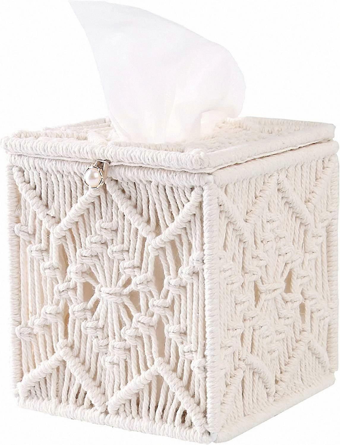 Boho Macrame Tissue Box Cover with Bead Buckle for Bathrooms and Farmhouse Decor Woven Napkin Holder Storage Organizer Cube Dresser Accessory