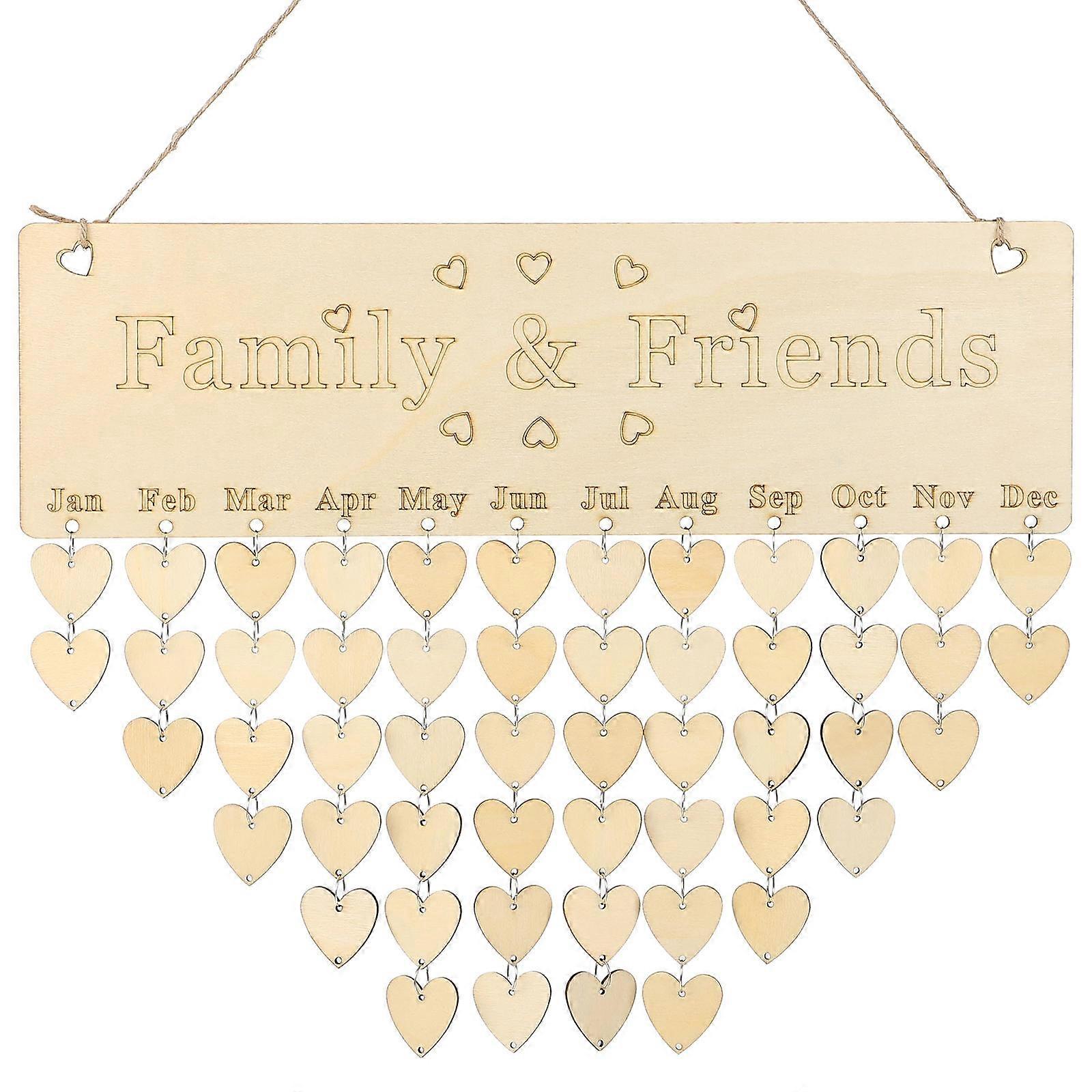 Description This wooden plaque calender comes with 1pc board, 1pc hanging rope, and 50pcs love heart shaped wooden accessories. All you have to do is wright on the wooden disc the Name and date and then it under the appropriate month. Great Gift for friends' birthday, Mother's Day, Father's Day etc. Features - Color: Shown in the pictures. - Material: Wood. - Size: Approx. 40 x 12 x 0.5cm/ 16 x 4.7 x 0.2 inch (LxWxH). - Printed Family & Friends Letters with imppecable detailed crafts. Can be used for home decoration. - You should never miss a birthday or anniversary, Mothers' Day, Fathers' Day etc. again with this unique friends & family tally board. - Easy system makes it simple to rearrange discs on board. - With DIY string together, so you can arbitrarily string out what you like. - Great Gift for a Birthday, Wedding, Anniversary, Valentine's Day, Mother's Day etc.Package list: 1 x Family Friends Birthday Reminder Wooden Plaque Board Hanging Calendar Gift for Home Decoration (1xPlaque + 1xRope + 50xLove Heart Shape Accessory)
