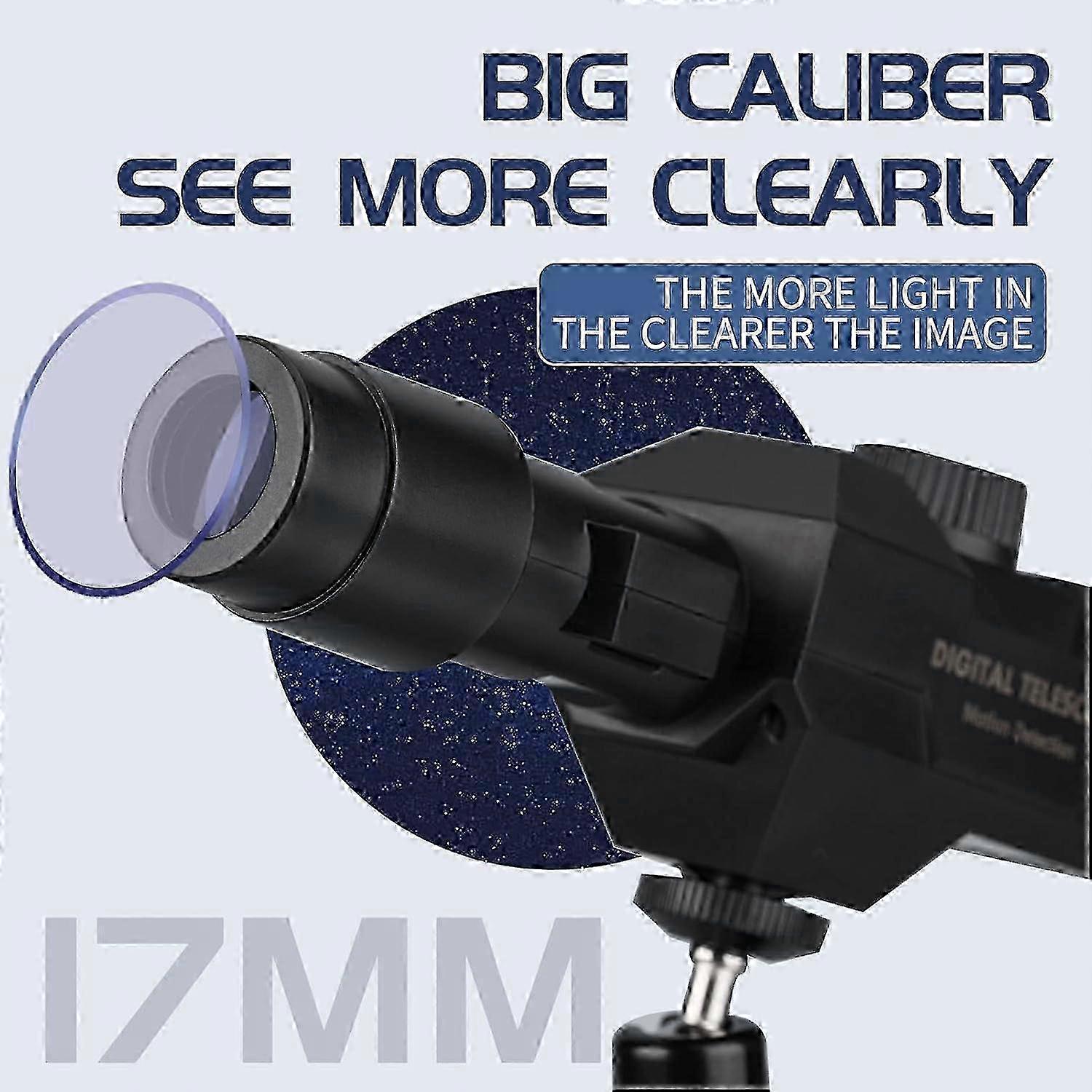 - 70x Zoom Capability : Easily focus on distant objects with a simple round button for precise control, allowing you to see intricate details up to 70 times closer. - High Definition Imaging : Capture stunning HD videos at a maximum resolution of 1920 x 1080 and photos at 1600 x 1200. Enjoy seamless remote control for video recording and photography. - Durable Design : The included dust cover protects the lens from scratches, ensuring optimal observation quality. The multifunctional head can be adjusted in multiple directions for effortless target tracking. - Wide Compatibility : Designed for use with both iOS and Android devices, making it easy to connect and share your findings. - Versatile Applications : Ideal for a variety of activities including birdwatching, hunting, hiking, camping, travel, and wildlife observation. Perfect for outdoor enthusiasts and nature lovers looking to enhance their experiences. - Compact and User-Friendly : Lightweight and portable, this digital telescope is easy to carry on all your adventures, ensuring you never miss a moment of nature's beauty. Experience enhanced viewing and capturing capabilities with this advanced digital telescope, making it a must-have for anyone passionate about the great outdoors. Note: Due to the light and screen setting difference, the item's color may be slightly different from the pictures. Please allow slight dimension difference due to different manual measurement.