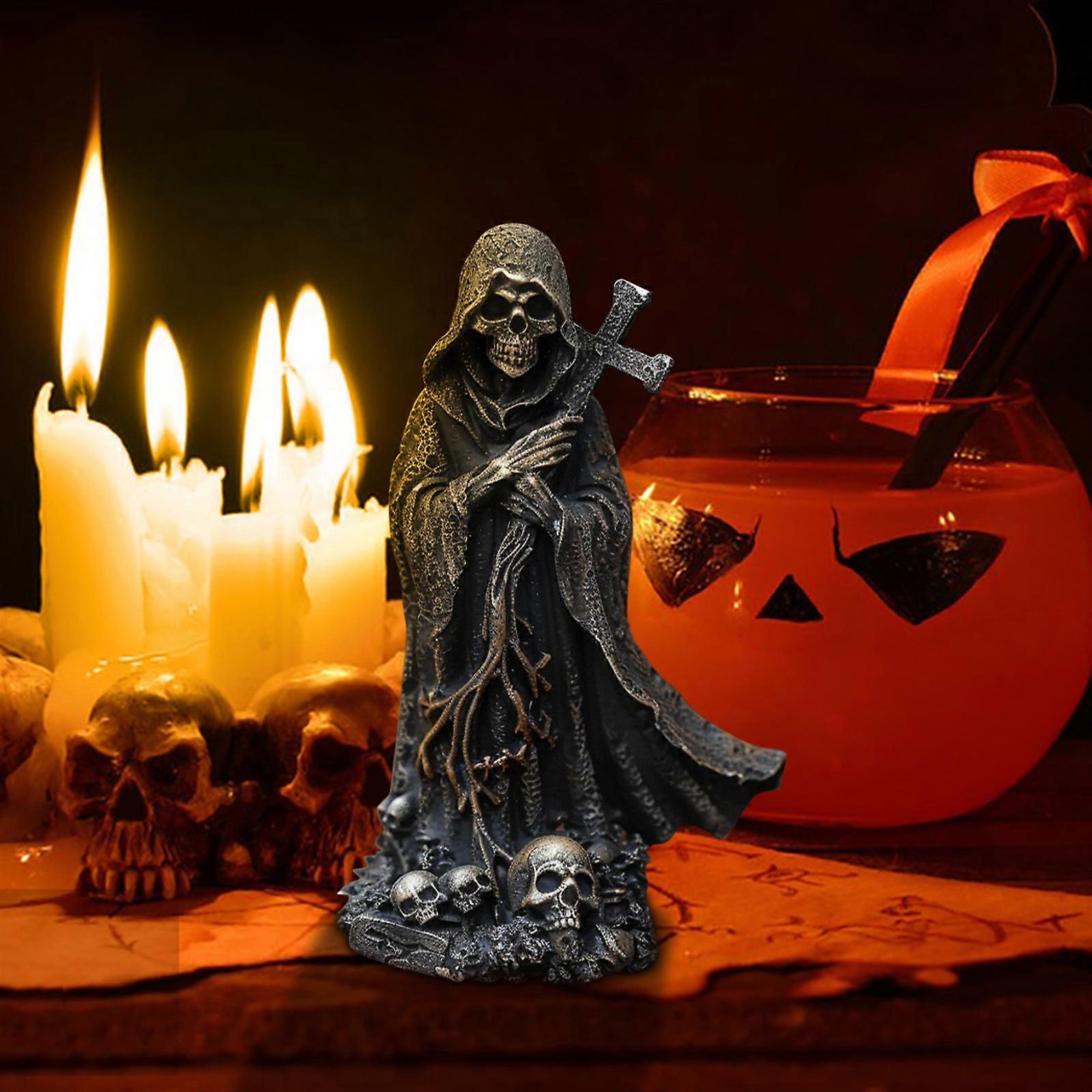 Grim Statue Holding Santa Muerte Statue Gothic Decor Figurine Resin Horror Statue For Halloween Decorations Indoor Holiday Ornaments FLY2779