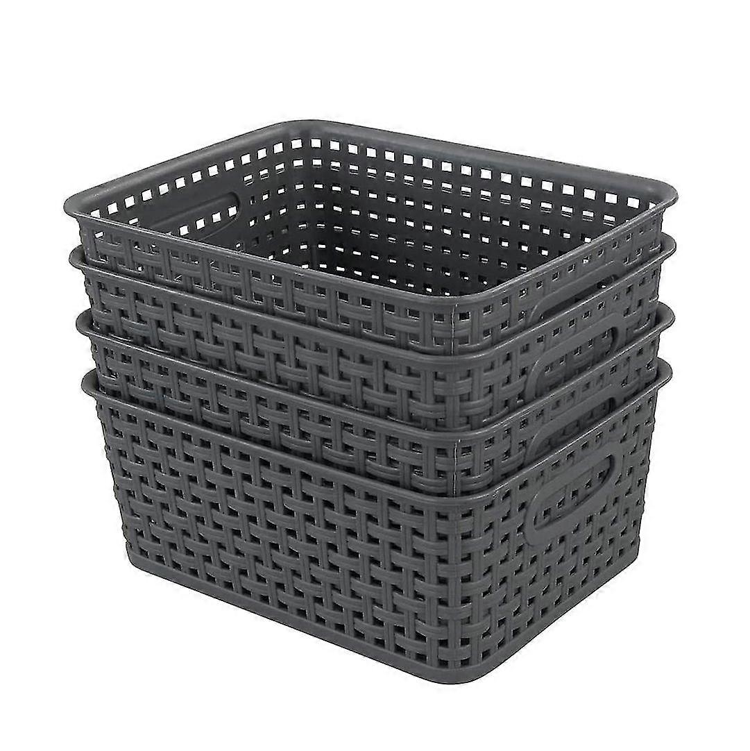 PRODUCT CONFIGURATION: 4 woven pattern plastic baskets, gray. Dimensions:10 inch L x 7.9 inch W x 4 inch H, basket use small holes design helping ventilation, better organization and storage items.DURABLE and SAFETY: This plastic material is high-quality, recyclable, flexible, and not easily been damaged when dropped from high places, which making the baskets durable and sturdy, keeping for long-term use. And it is totally BPA-free, please use it with confidence.MULTI-PURPOSE: The perfect -sized storage baskets are great for storing home supplies in all kinds of platforms in your house like closets, cabinets, shelves and countertops. They are super functional and practical in various rooms and places, such as kitchen, pantry shelves, bedrooms, bathrooms, living rooms, laundry rooms, offices, craft rooms, play rooms and garages.EASY TO USE: The storage containers can be very convenient to organize items, organizing ability very excellent, can also be laminated when not needed, it will not take up extra space. The basket has hollow handles, facilitating the movement of the basket, and improve organization efficiency, use them to organize your items will be a pleasureColour:grayMaterial:plasticPackage Contents:4 * storage basketsOnly the above package content, other products are not included.Note: Light and different displays may cause the color of the item in the picture a little different from the real thing. The measurement allowed error is +/- 1-3cm.