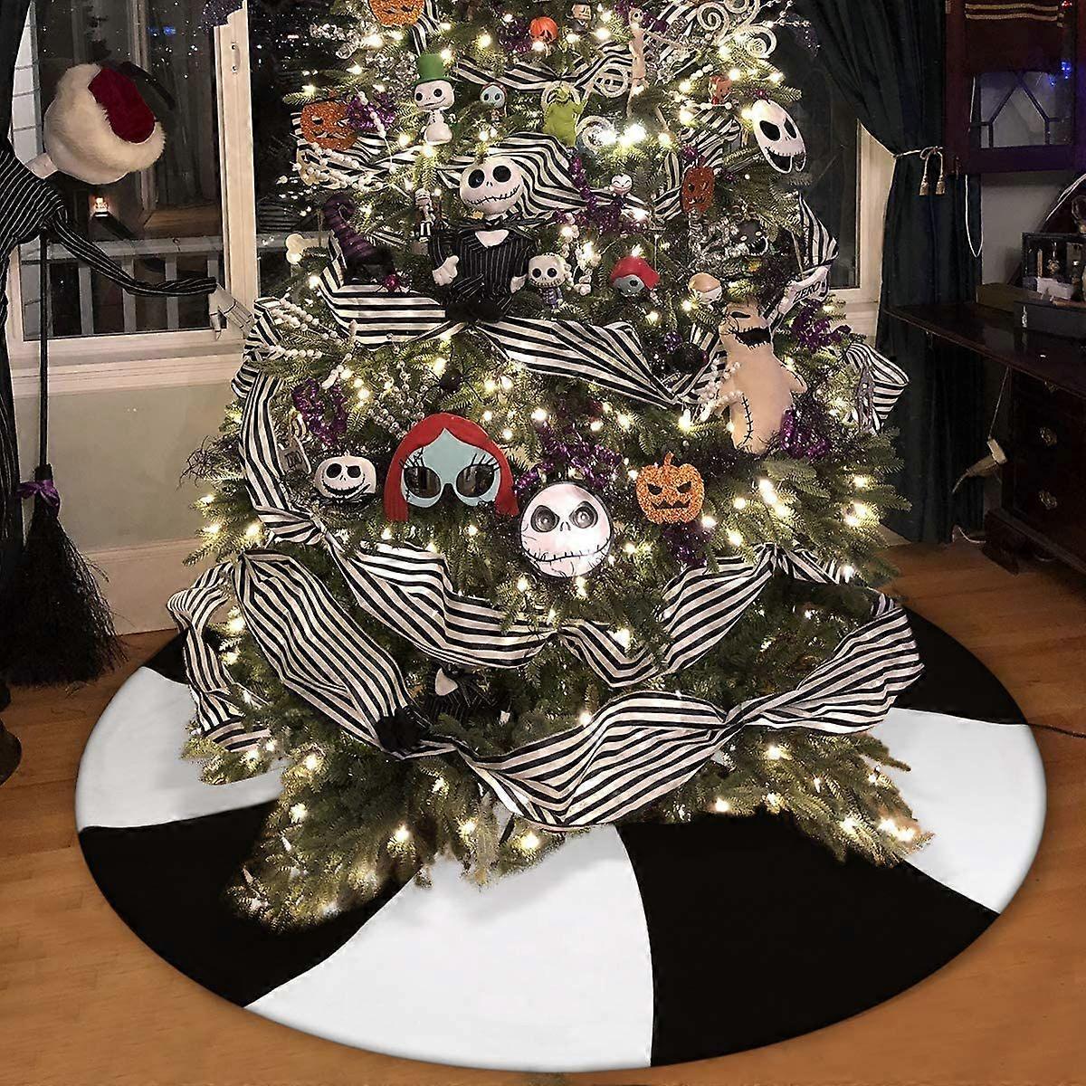 90 cm / 36 inches full Size tree skirt,fir for 4-6 feet Christmas trees.also perfect for slim tree. Thick polar lollipop fleece 2-layer fabric,thick soft and durable. Nightmare before Christmas decorations,perfect for grinch Halloween party decorations. Easy To Use:3 velcro at the Opening can Secure the Xmas Tree Skirt Conveniently Machine wash in soft mold or Hand Wash.no shade,no shrink.