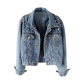 Women Denim Jacket Solid Color Single-breasted Short Breathable Keep Warm Beads Decor Long Sleeves Cardigan Imitation Pearl Autumn Coat