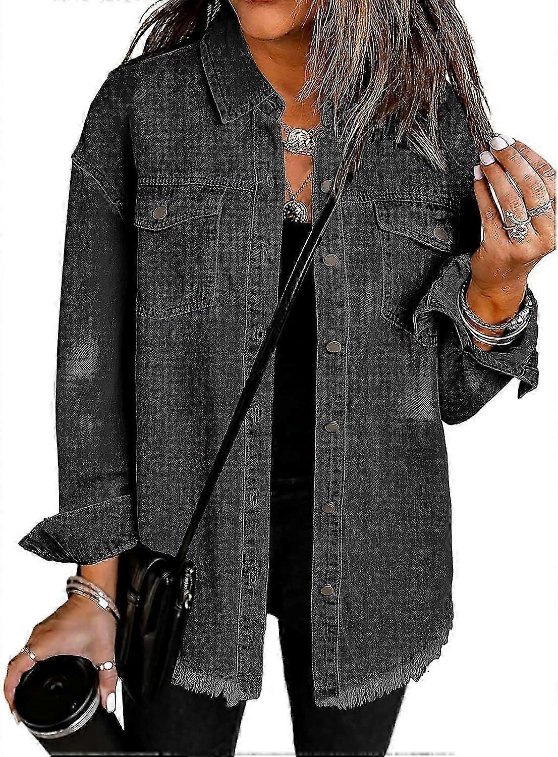 Womens Oversized Button Up Frayed Hem Shacket Long Sleeve Pockets Denim Jean Jacket