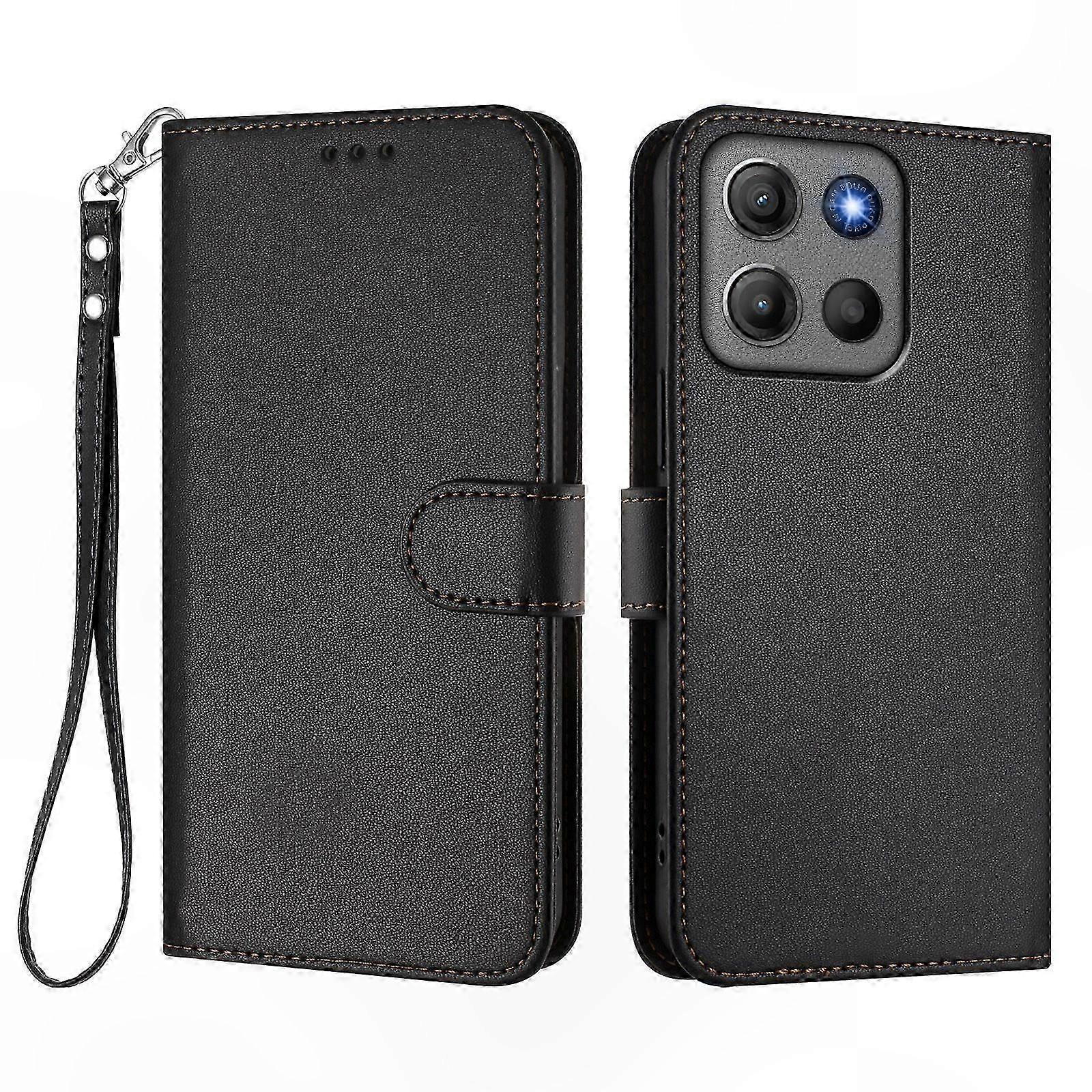 Leather Wallet Case with Stand and Wrist Strap for Moto G15 Power 4G / Moto G15 4G - Black Phone Cover