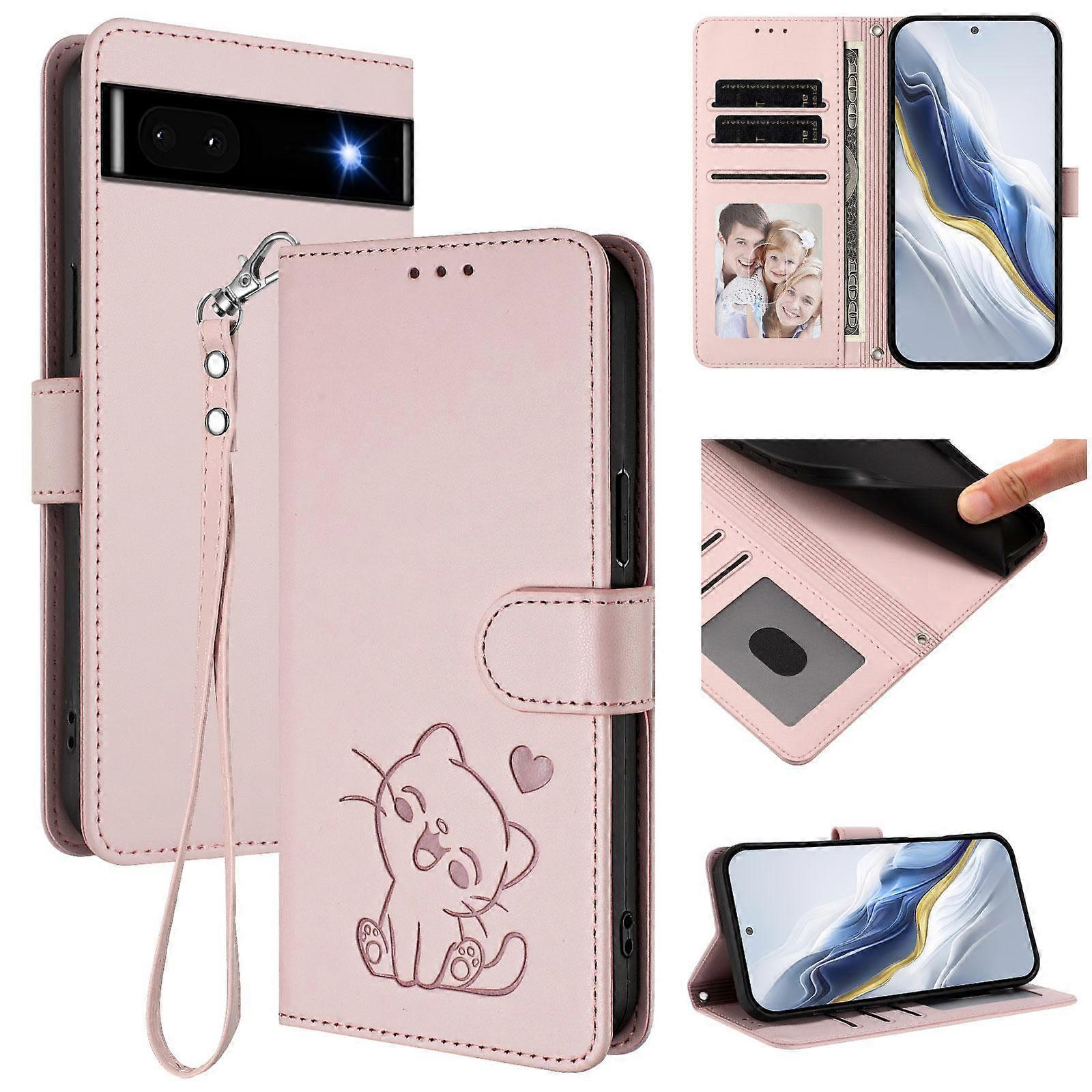 Embossed Heart Cat Leather Phone Case with Hand Strap